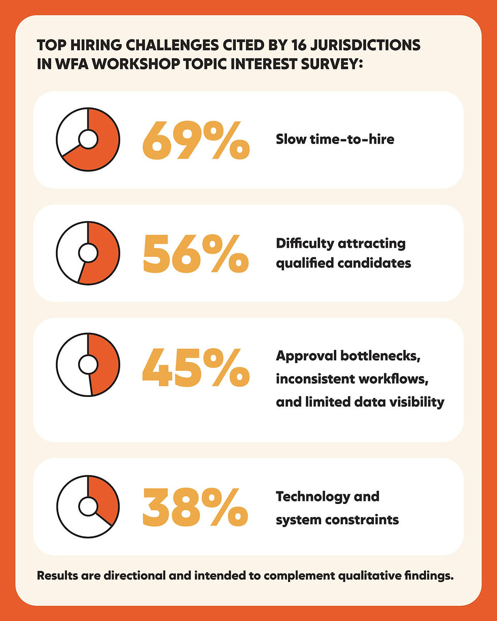 The report also cites four categories of structural issues that create friction in the hiring process. These include the difficulties presented by outdated hiring regulations, as well as the complications faced by individual governments due to the local economy, competition (both with other governments and the private sector), compensation constraints and limited hiring flexibility.